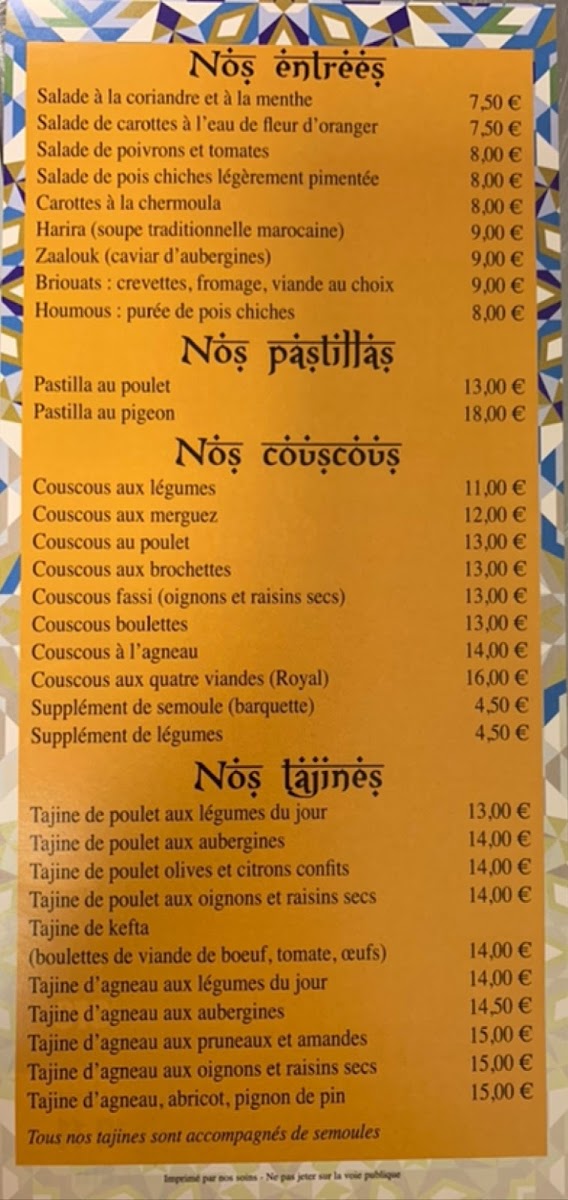 You'll find hearty options such as Couscous Poulet et Merguez and Pastilla au Poulet, dishes that bring together rich spices and fresh ingredients for satisfying, flavorful experiences. These dishes are well-suited to gatherings with family or friends, where sharing and conversation flow naturally around the table.